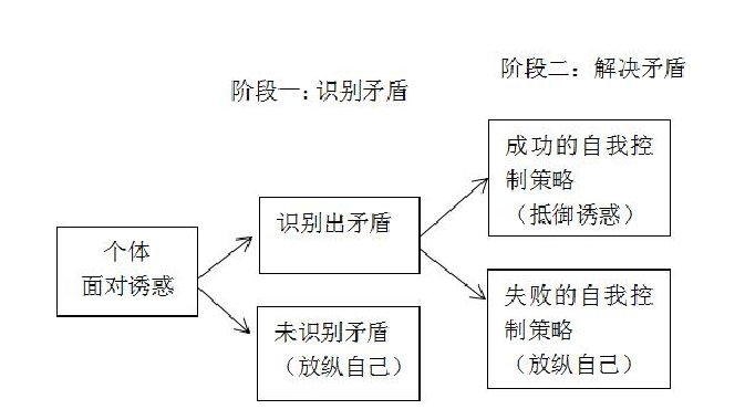 (2)自我控制的两阶段模型(Two-Stage Model)。Myrseth和Fishbach于2009年提出两阶段模型。他们的研究中提出自我控制的成功取决于识别诱惑与“更好的判断”之间的矛盾,以及成功的实施自我控制的策略。研究中举例说明识别矛盾和实施策略的重要性,如糖尿病患者在面对丰富的晚餐时会考虑吃的过多易导致自身血糖水平升高,因此在这种情况下,患者会调用自身的自我控制能力控制自己一餐的摄入量达到维持健康生活的目标。糖尿病患者看到了问题的矛盾所在,但大多数情况下,认识矛盾并采用正确的策略解决矛盾并不容易,如正常人在吃非常丰盛的晚餐时可能不会考虑到摄入过多引起血糖升高的现象,但是高热量的摄入也会使个人的生理指标产生微小的变化,若经常如此,必会给个人身体健康方面带来不利影响。如成语“水滴石穿、积少成多”描述的画面和表达的含义那样,Myrseth和Fishbach创造了“成本诱惑”一词。成本诱惑是指在面对诱惑时,单一放纵自己带来的影响可能微乎其微,但是久而久之,在越来越多诱惑累计的情况下,其影响不可小觑。如减肥者在面对美食时一次放纵自己后,在今后面对更多的美食诱惑时很可能禁不住诱惑。自我控制的两阶段模型具体内涵如下:阶段一,个体在面对诱惑时必须确定清楚放纵自己和实现更高层次的目标之间是否存在矛盾。阶段二,当且仅当个体识别出矛盾后,他们才会采用自我控制策略,促使自己追求更高层次的目标而不是沉溺在当下的诱惑中。否则,个体会识别不出矛盾(阶段一)或者运用自我控制能力抵御诱惑失败进一步放纵自己(阶段二)。虽然结果相似,都是放纵自己,但是这两种放纵的原因不同(图)。