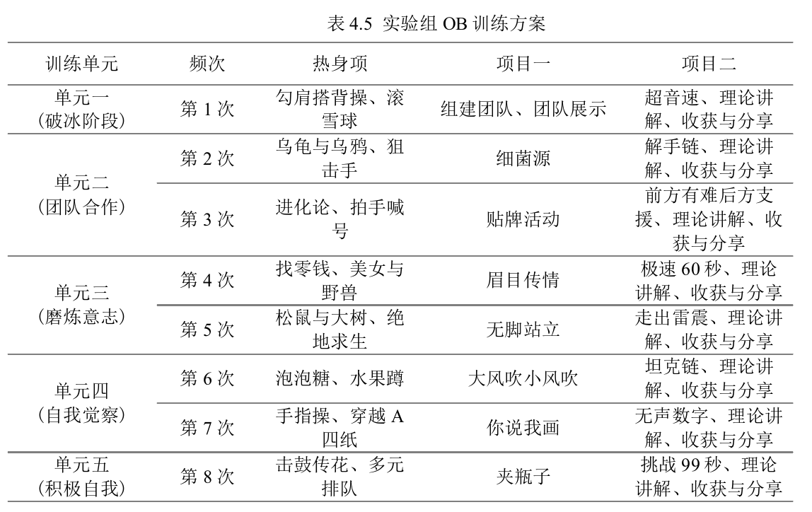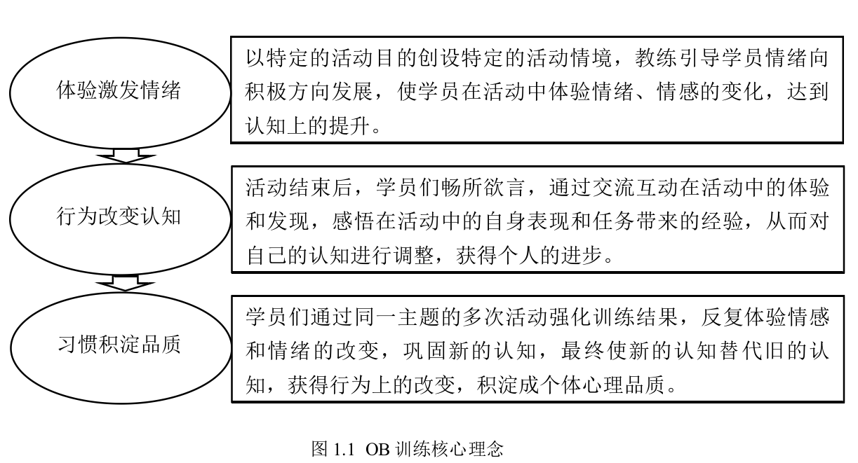 Outward Bound是OB训练的全称,也可以叫做拓展训练、行为训练等,指由教练创设一定的模拟情境,让学员在团队中通过真实的任务场景去解决问题和应对挑战,在完成任务后,学员们在团队中分享感悟,获得成长(孙远刚,2016),属于体验式培训。在二战期间1个真实的故事是OB训练的起源,盟军在大西洋上进行激烈战斗时被德军纳粹潜艇袭击,船上的战士和船员们被迫跳入海中,由于冬天的海水很凉,很多落海的人在救援赶到之前就丧生了,但也有一部分人生存了下来。这时人们都认为生存下来的一定是身体素质好的青壮年,但是后来人们发现,在成功生存下来的这些人中,多的并不是猜测中的青壮年,而是年纪较大且体力较差的老将士。对于这个令人不解的问题,有许多学者通过大量的对比研究去探索这一问题的答案,发现本次海上生还的人,具备丰富的经验、顽强的意志、坚毅的心理素质和团队合作意识。